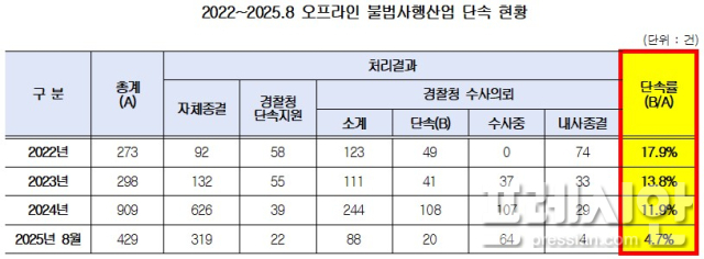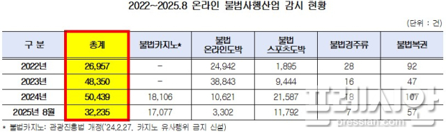 문제는 단속 실적이 오히려 줄고 있다는 점이다. 현장 불법도박 단속률은 2022년 17.9%에서 2025년 8월 현재 4.7%로 4분의 1 수준으로 감소했다. 감시 대상과 범위는 넓어졌지만 단속 성과로 이어지지 못한 것이다.