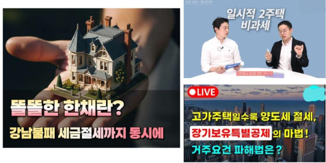 ▲1주택자 양도세 장기보유특별공제 등 투기를 뒷받침하는 제도를 이용한 절세 전략을 소개하는 콘텐츠들. 출처: 유튜브 등에서 캡처 후 채널명 가림