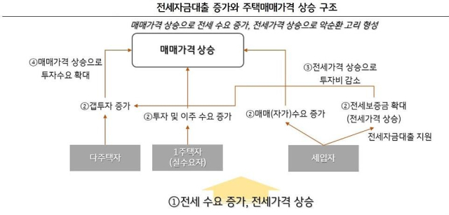 ▲2022년 KB경영연구소에서 발간한 보고서 ‘전세자금대출 증가에 따른 시장 변화 점검’에 수록된 그림. 전세자금대출이 전세가격 상승에 영향을 미치고 주택 보유자의 투자수단으로 이용되는 구조를 보여준다. ⓒKB경영연구소