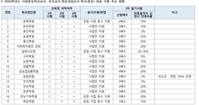 이는 시교육청이 올해 사학법인들과의 협의를 통해 '1차 필기시험 성적 20% 이상 의무 반영' 규정을 삭제한 데 따른 결과다.