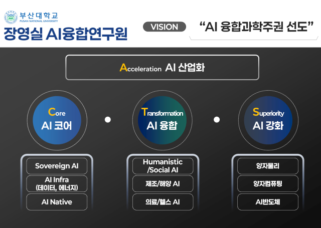 국내 최초로 '양자' 분야를 AI 융합연구 체계에 포함시킨 것도 특징이다. 부산대는 이를 통해 AI와 양자물리·양자컴퓨팅·AI 반도체 간의 융합연구로 차세대 계산혁명을 선도하고 AI의 한계를 극복하는 퀀텀 AI의 실증적 연구기반을 구축한다.