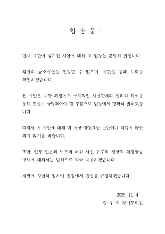 양우식(국민의힘·비례) 경기도의원은 4일 입장문을 통해 "검찰의 공소사실을 인정할 수 없으며, 재판을 통해 무죄를 확인하겠다"고 밝혔다.