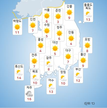밤사이 기온은 7~10도, 새벽에는 3~5도까지 떨어져 낮과 최대 15도의 큰 일교차를 보일 전망이다.