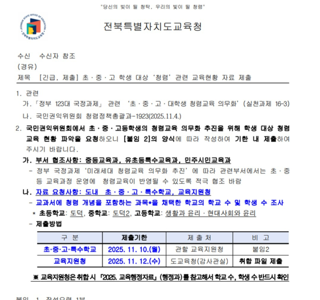 또한 전북교총은 “교과서의 청렴 관련 내용을 조사하겠다면 국가교육과정만 분석해도 충분하다”고 지적했다. 교과서는 국가교육과정을 바탕으로 제작되며, 이미 교육부 심의와 검정을 거친 공적 자료이기 때문이다. 전북교총은 “굳이 학교별 교과서 목록을 수집할 필요가 없으며, 이러한 요구는 불필요한 행정 부담을 초래할 뿐 아니라 자칫 학교 간 비교와 평가로 이어질 위험이 있다”고 덧붙였다.