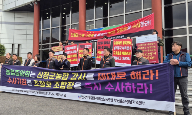 민주노총 전국사무금융서비스노동조합 부산울산경남지역본부는 12일 경남 창원에 있는 농협중앙회 경남본부 앞에서 기자회견을 열고 "즉시 수사와 농협중앙회는 재발방지대책을 마련하라"고 촉구했다.