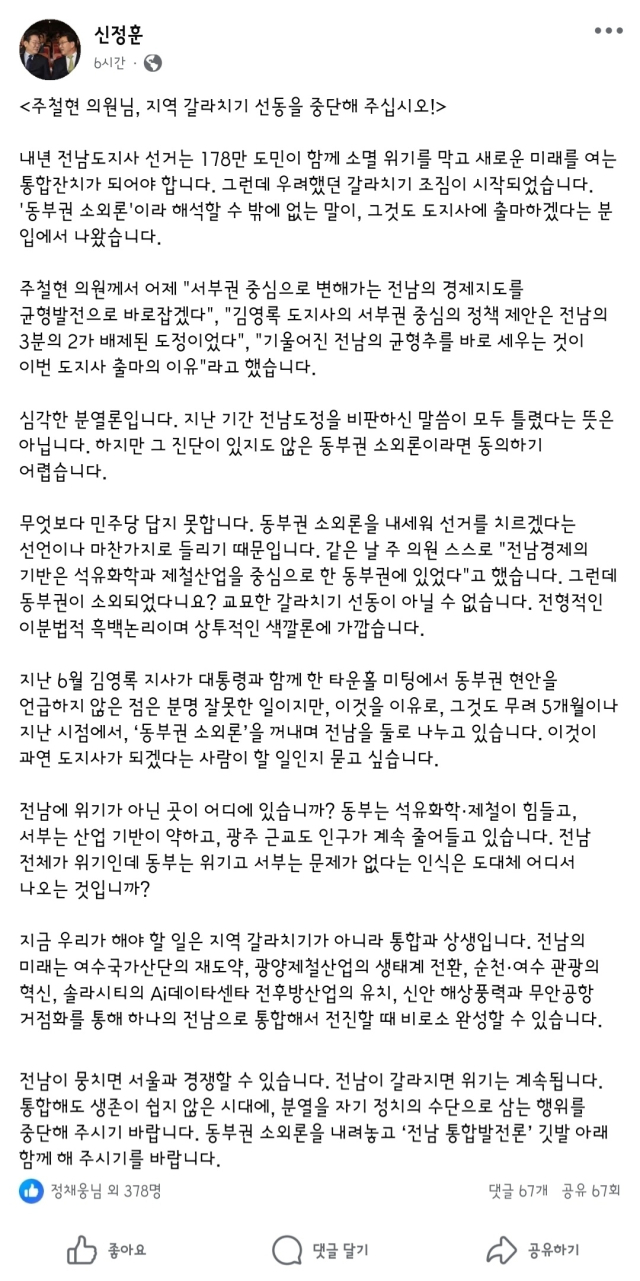 20일 신 의원 자신의 SNS에 "주철현 의원님, 지역 갈라치기 선동을 중단해주십시오!"라는 제목의 글을 게재했다.