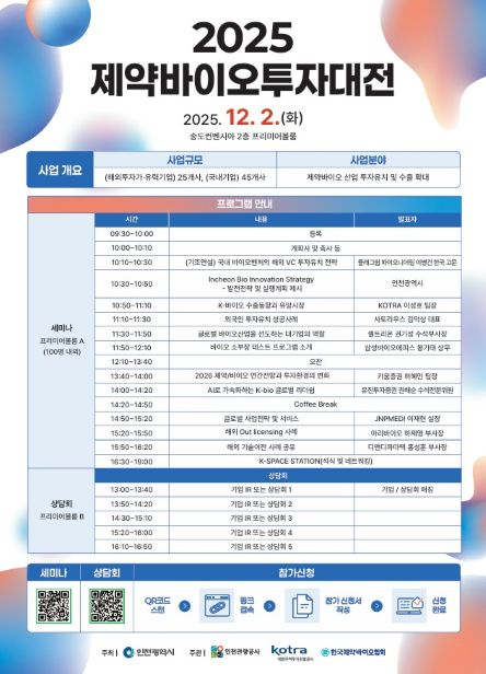 27일 인천시에 따르면 이번 행사는 △최신 투자 동향을 공유하는 콘퍼런스 △실질적 비즈니스 성과 창출을 위한 1:1 투자·수출상담회를 중심으로 진행되며, 글로벌 제약‧바이오산업의 네트워킹과 협력 강화를 목표로 하고 있다.