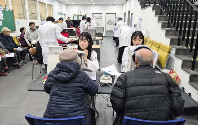 봉사에 나선 경동대 안경광학과 봉사동아리(회장 윤성흠·박예지) 학생들은 먼저 예진과 문진으로 눈건강 상태부터 파악했다.