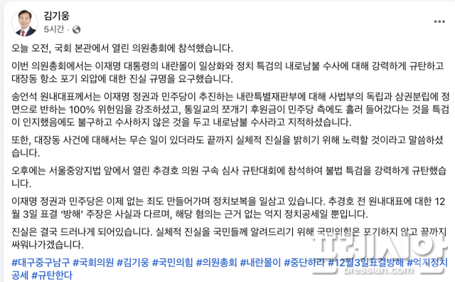 반면 대구지역 다른 의원들은 신공항 예산 누락에 대해 별도 입장을 내지 않았다. 일부 의원들은 민주당을 향한 규탄 논평, 특검이 청구한 추경호 의원(달성군) 구속영장 비판 등 정치공세성 메시지에 집중해 지역 현안과 온도 차가 두드러진다는 지적이 나온다.