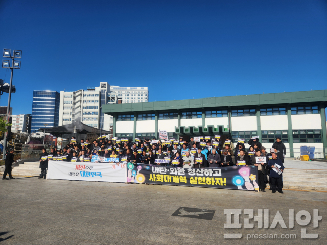'빛의 혁명 1년, 내란·외환 종식과 사회대개혁을 염원하는 광주공동체'는 이날 오전 5·18민주광장에서 250여 명의 시민들이 참석한 가운데 기자회견을 열고 "이재명 정부는 중단 없는 개혁에 나서라"며 즉각적인 개헌 논의 착수 등을 촉구했다.