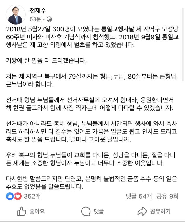 그러면서 전 의원은 "선거 때가 아니라도 동네 형님, 누님들께서 시간되면 행사에서 와서 축사라도 하라 하시면 다 갈 수는 없어도 가끔은 얼굴도 뵙고 인사도 드리고 축사도 한 말씀 드린다"고 덧붙였다. 그는 "다시 한 번 말씀드리지만 단연코 분명히 불법적인 금품 수수 등의 일은 추호도 없었음을 말씀드린다"고 강조했다.