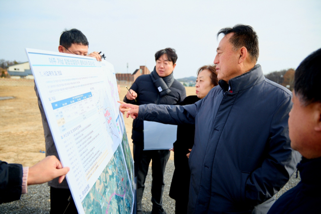 ▲이충우 여주시장이 가남산단 입지 예정지를 방문해 현황 설명을 듣고 있는 모습이다. ⓒ 여주시