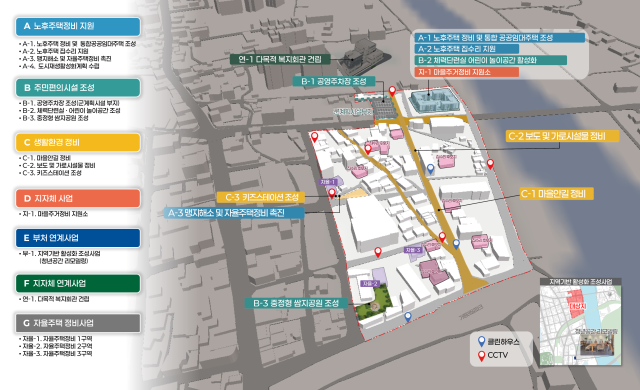 노후주택 정비 분야에서는 안전등급 D등급인 준일빌라 등 노후 공동주택을 철거한 뒤 통합공공임대주택 64세대를 조성해 주거 취약계층의 주거 안정을 도모함과 동시에 개별 노후주택에 대한 집수리 지원을 병행하고, 맹지 해소 등 합리적인 토지 이용을 통해 주민들이 주도하는 주택정비도 추진한다는 계획이다.