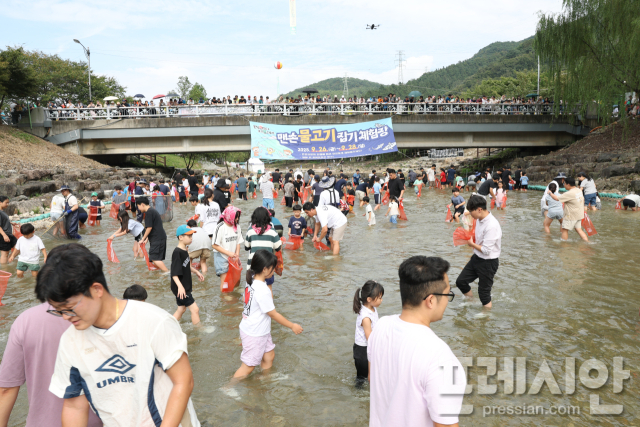 ▲ '제13회 완주와일드&로컬푸드축제' 기간 고산자연휴양림 일원에서 열린 ‘맨손물고기잡기 체험’ 모습. 관광객들이 물속에서 직접 물고기를 잡으며 축제를 즐기고 있다. ⓒ완주군