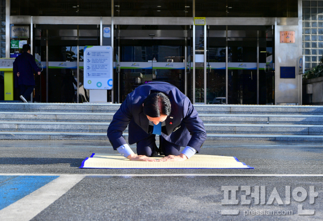 ▲김한종 군수가 군청 앞에서 군민들에게 큰절을 하고 있다ⓒ장성군