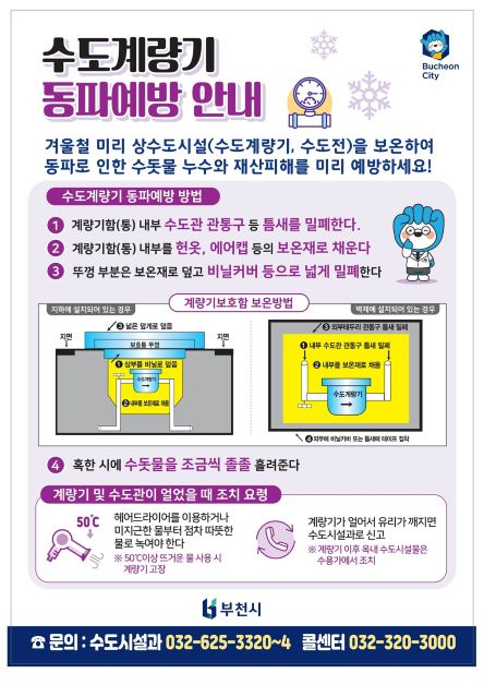 동파방지팩 신청이나 동파 관련 문의는 부천시 상수도 종합상황실(032-625-3320~4), 부천시 콜센터(032-320-3000), 또는 가까운 행정복지센터로 하면 된다.