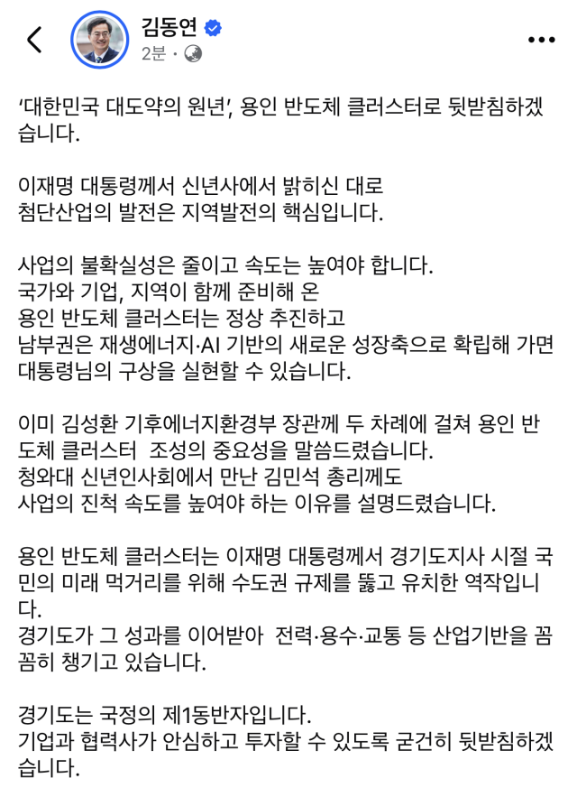 이는 앞서 지난 4일 김 지사가 자신의 SNS를 통해 "이재명 대통령께서 신년사에서 밝히신 대로 첨단산업의 발전은 지역발전의 핵심으로, 사업의 불확실성은 줄이고 속도는 높여야 한다"고 강조한 뒤 "국가와 기업 및 지역이 함께 준비해 온 용인 반도체 클러스터는 정상 추진하고, 남부권은 재생에너지·AI 기반의 새로운 성장축으로 확립해 가면 대통령의 구상을 실현할 수 있을 것"이라고 밝히며 타 지역으로의 이전에 대해 반대 입장을 나타낸데 대한 것이다.