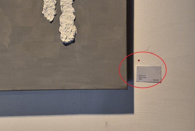 <프레시안>이 전시 현장을 확인한 결과 전시작 옆에는 작품 설명과 가격표가 붙어 있었으며 적게는 7만 원에서 많게는 150만 원대까지 가격이 책정돼 있었다. 다수 작품에는 판매가 완료됐다는 표시로 '빨간색 스티커'도 붙어 있었다.