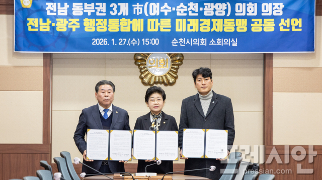 28일 여수·순천·광양시의회에 따르면 전날 백인숙 여수시의회 의장과 강형구 순천시의회 의장, 최대원 광양시의회 의장이 전남·광주 행정통합에 대응해 전남동부권의 공동발전과 위상 강화를 위한 미래경제동맹 공동선언문을 발표했다.
