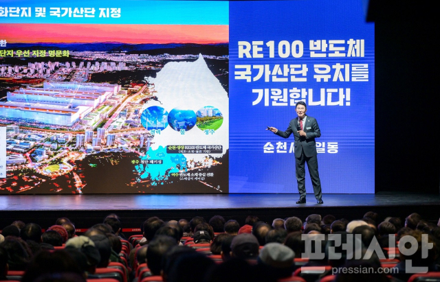 "지역 소멸을 막고 우리 미래세대를 위해 순천이 보유한 주암댐과 상사댐의 맑은 물을 지렛대로 반드시 'RE100반도체 산단'을 순천에 유치해야 합니다. 전남 동부권 소외를 막아낼 반도체 산단과 지역 예산을 약속하지 않으면 통합에도 찬성하면 안됩니다."