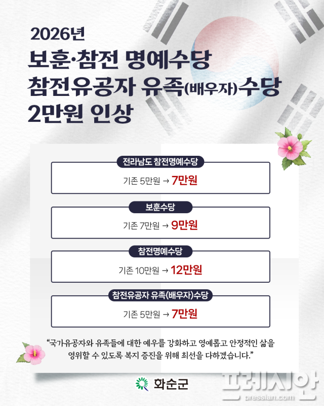 이번 인상 대상은 △화순군 보훈수당 △화순군 참전명예수당 △화순군 참전유공자유족(배우자)수당 △전라남도 참전명예수당 등으로 각각 매월 2만 원씩 인상된다.