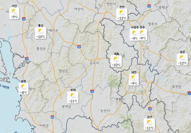 이날 낮 최고기온은 대전 1도, 세종 3도, 청주·천안 2도, 아침 최저기온은 -11도 수준으로 전망된다.