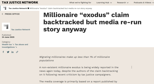"존재하지도 않는 백만장자들의 대규모 탈출 소식이 오늘 다시 언론에 널리 보도되고 있다. 하지만 이 주장을 제기한 사람들은 최근 조세 정의 운동가들의 비판에 직면하여 해당 주장(대규모 탈출)을 철회했다."