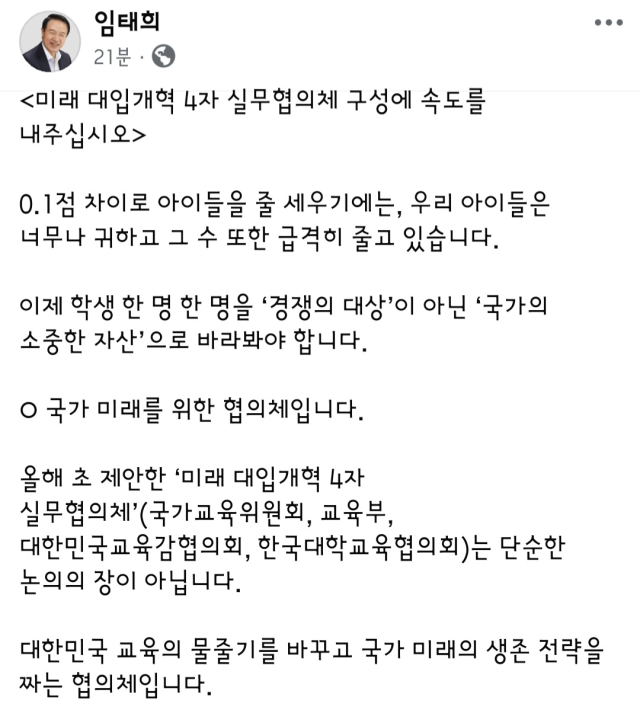임 교육감은 5일 자신의 SNS를 통해 "미래 대입개혁 4자 실무협의체 구성에 속도를 내달라"고 목소리를 높였다.