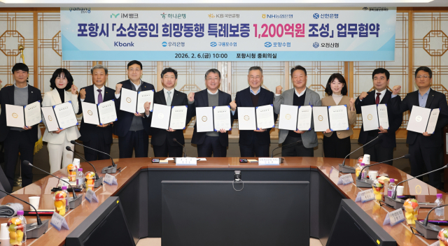 포항시는 6일 경북신용보증재단과 시중·지역 금융기관 10곳과 업무협약을 체결하고, 총 1,200억 원 규모의 ‘희망동행 특례보증’ 대출 지원을 오는 9일부터 시행한다고 밝혔다.