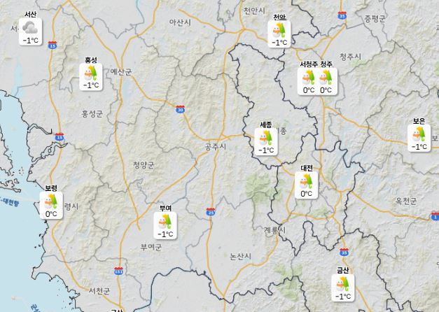 이날 낮 최고기온은 대전·천안 5도, 세종·청주 6도, 아침 최저기온은 -1도 예보됐다.
