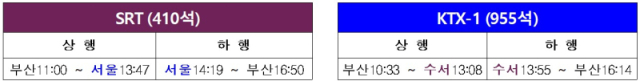 KTX는 부산역~수서역행이, SRT는 부산역~서울역행이 마련된다.