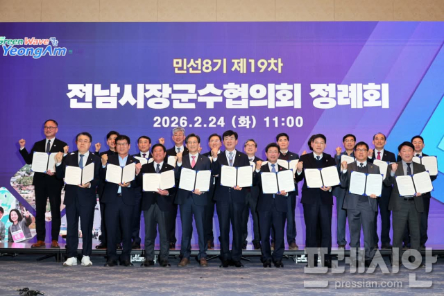 ▲24일 김성 장흥군수가 영암 현대호텔에서 열린 전남시장군수협의회에서 마지막 공식 회의를 주재하고 있다.2026.2.24.ⓒ프레시안