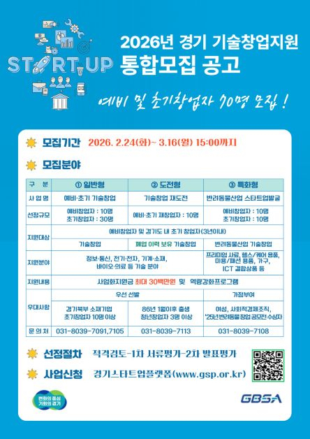 경기도와 경기도경제과학진흥원은 도내 예비창업자와 초기·재도전 창업자를 대상으로 ‘2026년 경기 기술창업 지원사업’ 통합 모집을 진행한다고 27일 밝혔다. 모집은 다음 달 16일까지며, 총 70개사를 선발한다.