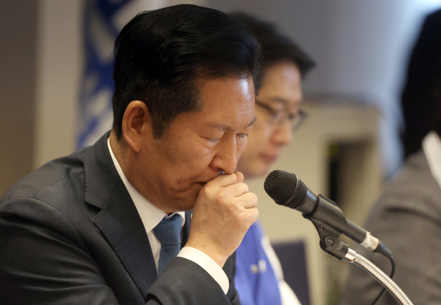 ▲더불어민주당 정청래 대표가 18일 경남 진주시 MBC컨벤션진주 대연회장에서 열린 현장 최고위원회 회의에서 발언 중 손으로 입을 잠시 막고 있다. ⓒ연합뉴스