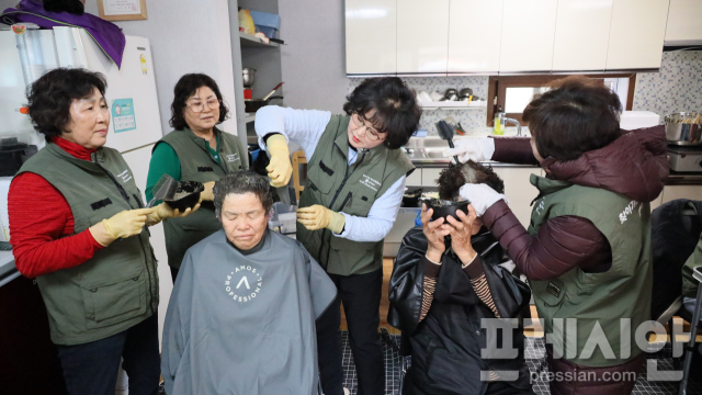 ▲신미경 원장과 자원봉사자들이 마을 어르신들 염색 봉사를 하고 있다.2026.3.19ⓒ프레시안(위정성)