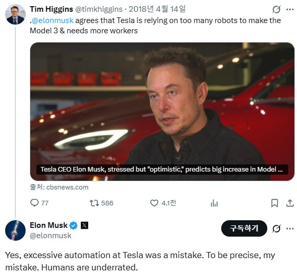 일론 머스크는 캘리포니아 공장에서 먹고 자며 생산라인 정상화를 위해 온힘을 쏟는다. 초췌한 얼굴로 응한 <CBS>의 인터뷰 기사 트윗에 일론 머스크는 "인간 노동자를 너무 과소평가했다(Humans are underrated)"며 댓글을 달기도 했다. (아래 트위터 갈무리 사진)
