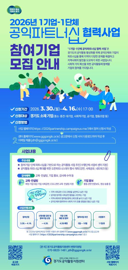경기도공익활동지원센터는 도내 기업과 공익단체 간의 전략적 파트너십을 통해 지역 공익활동을 활성화하기 위한 ‘2026년 1기업-1단체 공익파트너십 협력사업’에 참여할 기업을 오는 16일(오후 5시)까지 모집한다.