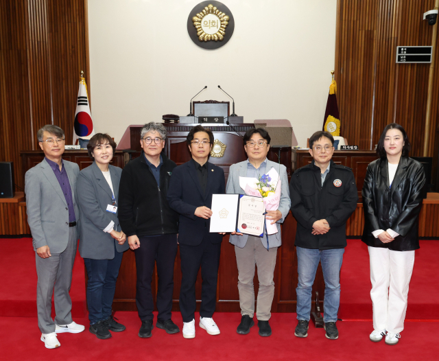 ▲대구달서구의회(의장 서민우)가 8일, 오랜 시간 ‘개구리 소년’ 추모 공간을 세심하게 관리해 유가족들의 아픔을 묵묵히 보듬어 온 달서구청 공원녹지과 공원1팀장에게 감사장을 수여하고 기념촬영을 하고있다ⓒ대구달서구의회 제공