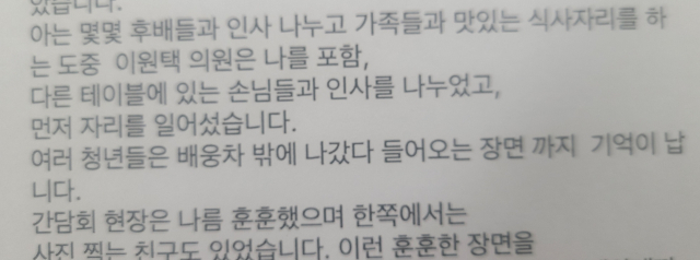 A씨는 "(당시) 가족들과 함께 정읍의 B식당에 식사하러 갔다. 그런데 우연히 이원택 의원과 정읍청년들과의 간담회 현장을 보았다"며 "아는 몇몇 후배들과 인사 나누고 가족들과 맛있는 식사자리를 하는 도중 이원택 의원은 나를 포함, 다른 테이블에 있는 손님들과 인사를 나누었고 먼저 자리를 일어섰다"고 밝혔다.