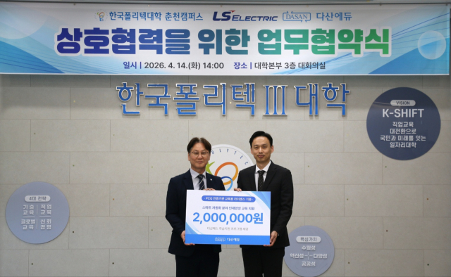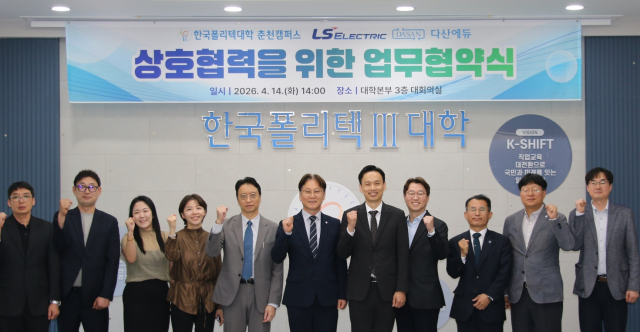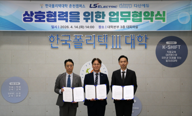 정부 산하 국책기술대학인 한국폴리텍Ⅲ대학(학장 지경배) 춘천캠퍼스가 14일 LS일렉트릭, ㈜다산에듀(대표 전병칠)와 ‘PLC제어기술자’ 자격 사업의 성공적인 추진을 위해 업무협약을 체결했다.