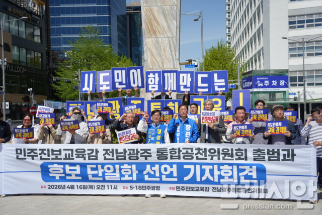 ▲16일 광주 동구 5·18민주광장에서 열린 '민주진보 교육감 전남·광주 통합공천위원회 구성 및 단일화 합의 선언' 기자회견.2026.04.16ⓒ프레시안(김보현)