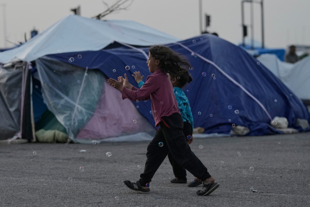 ▲15일(현지시간) 레바논 베이루트 남부 교외 다히예에 있는 이스라엘 공습 대피 천막 근처에서 소녀들이 비눗방울을 잡으려 하고 있다. ⓒAP=연합뉴스