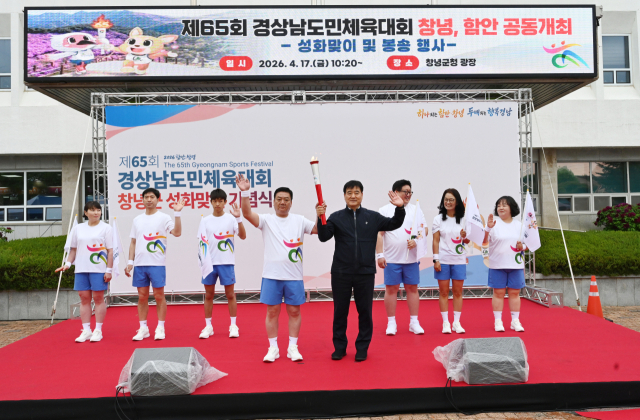 창녕군은 17일 군청 광장에서 '제65회 경상남도민체육대회'의 성공 개최를 기원하는 성화 도착 환영식과 봉송 출발 행사를 열고 본격적인 축제 일정에 돌입했다.