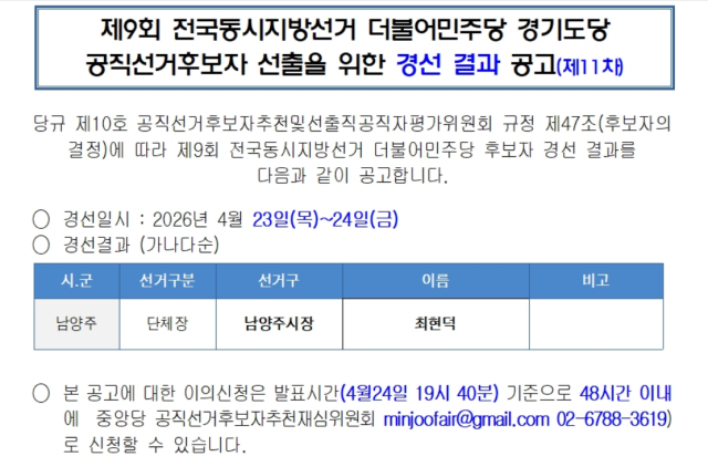더불어민주당 경기도당은 24일, 남양주시장 민주당 후보로 최현덕 예비후보가 확정됐다고 발표했다.