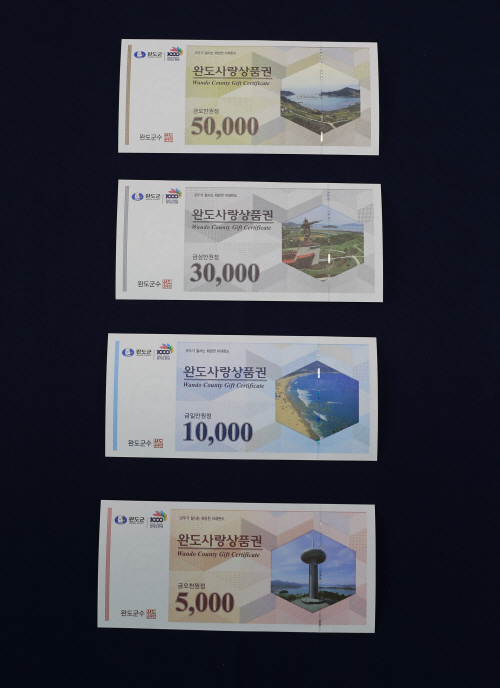 전남 완도군은 지난 7월 지역 내 소비 촉진과 자금 역외 유출을 방지하기 위하여 40억 원 규모의 완도사랑상품권을 발행하여 30억 원을 판매하였으며, 지난 11월에는 110억 원을 추가 발행했다.