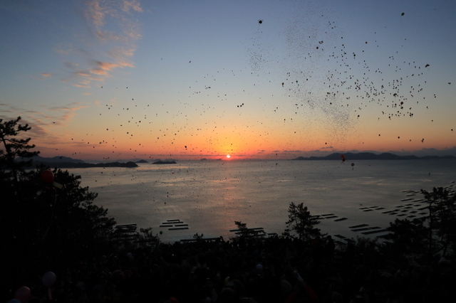 오전 7시 40분 쯤, 바다 위로 붉은 해가 떠오르자 환호성이 터져 나왔고 저마다의 새해 소망을 적은 소망 풍선을 날린 후 일출을 감상했다.
