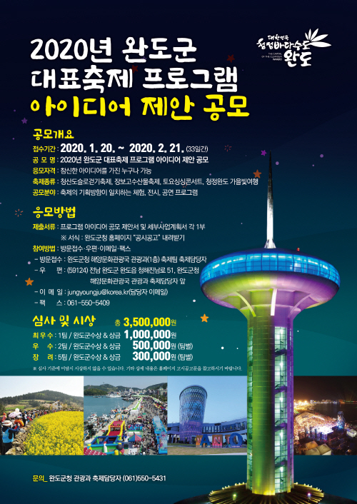 공모 기간은 오는 1월 20일부터 2월 21일까지이며, 제안의 실현 가능성과 경제성 등 5가지 항목을 심사해 3월 중 결과를 발표할 예정이다. 참여는 완도군청 홈페이지 고시공고란에서 제안서와 세부계획서 서식을 내려 받아 작성한 뒤, 완도군청 관광과(1층)를 직접 방문하거나 E-mail, 팩스, 우편 등을 이용해 제출하면 된다.