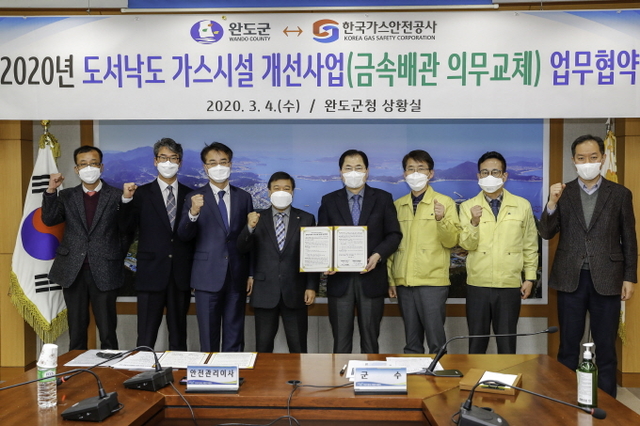전남 완도군과 한국가스안전공사는 지난 4일, 군청 상황실에서 도서지역 외딴섬LP가스 노후시설 및 부적합 시설 개선과 안전장치(타이머 콕) 보급을 위한 업무협약을 체결했다.