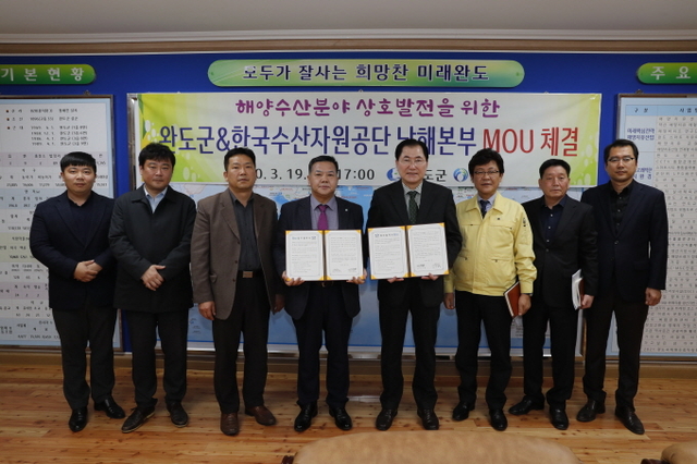 전남 완도군은 지난 19일 한국수산자원공단 남해본부와 해양수산 분야 정책 공동 개발 등 상호 발전을 위한 업무협약을 체결했다.