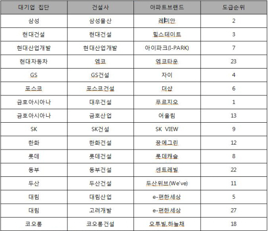 〈표 4〉주요 대기업 집단 소속 건설사 아파트 브랜드와 도급순위 (2008년)